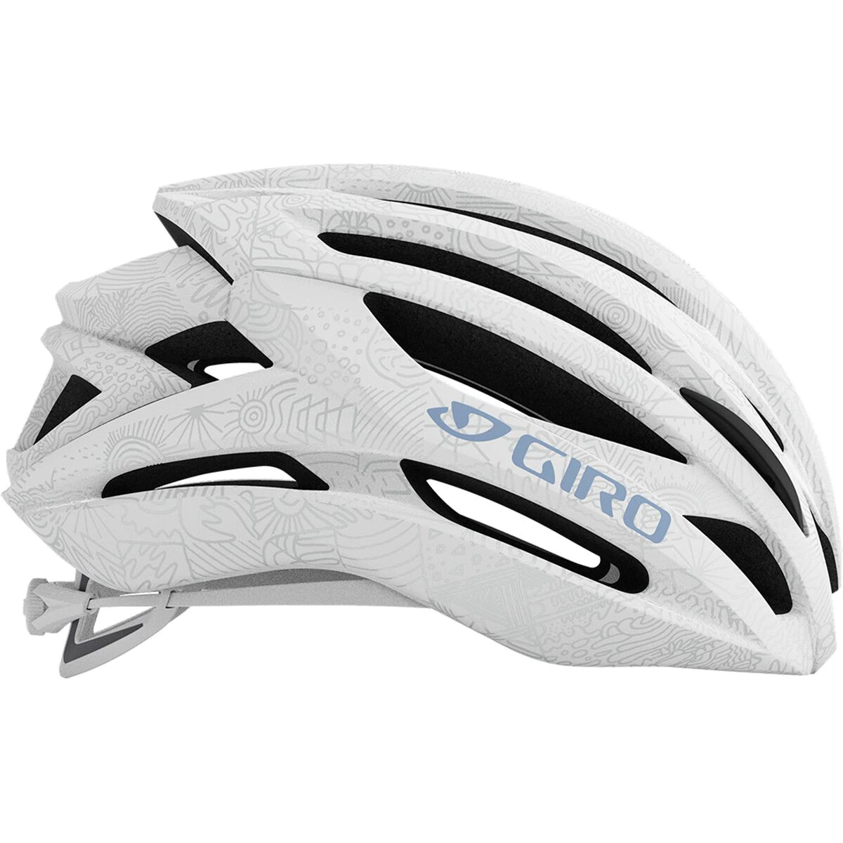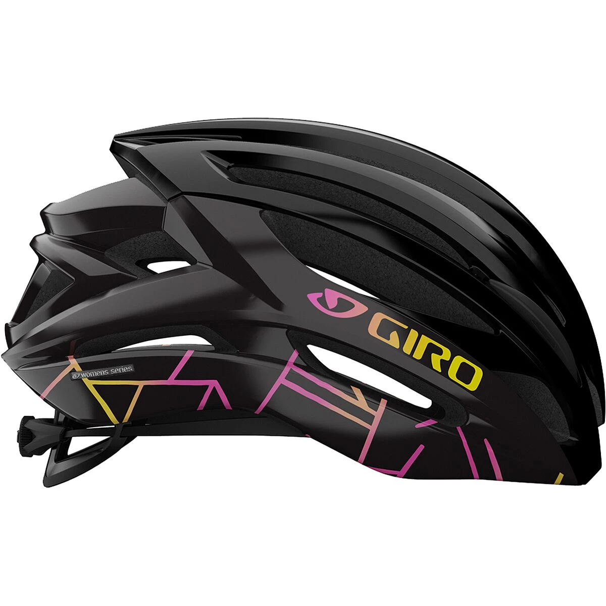 Just under the top tier Ember within Giro’s women’s specific road cycling helmet line is the Seyen MIPS Helmet. With a slight side-step from the norm, Giro chooses a “European” design and engineers the Seyen to sit a little deeper for added protection all-around while also pairing it with the MIPS integrated safety system. An outer shell of hard polycarbonate is bonded with an EPS foam liner using InMold technology to boost safety as well as reduce weight. Striking graphics help the Seyen make an impact compared to the more subdued helmets in your riding group, and a unique venting layup adds a touch more. With 25 Wind Tunnel vents and an internal channel network to keep you cool on hot days, the open front V-shaped vent sets the Seyen apart from other helmets in Giro’s lineup. At the rear, the Seyen is equipped with Giro’s familiar Roc Loc 5 fit system for easy adjustments with a roll-dial that can be operated on the go even with gloved hands.